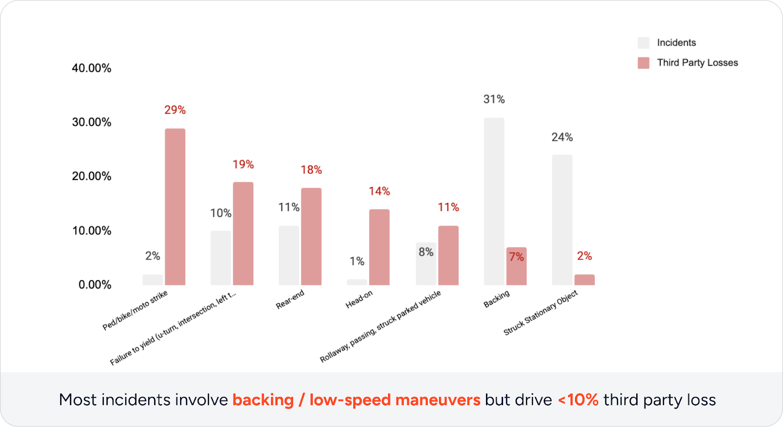 This post builds on that idea. Many smaller and mid-size fleets discount catastrophic risks because they haven’t experienced them firsthand, but severity isn’t only about rare events like infrastructure damage or pedestrian fatalities. A significant portion of severity is contributed by events that happen relatively often and can carry a high price tag.