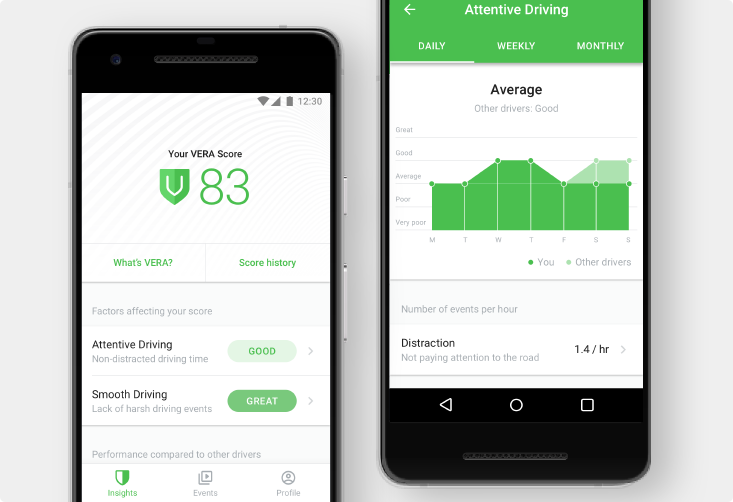 - Understand their safety performance for each trip, day, week or month by reviewing their personalized VERA Scores™